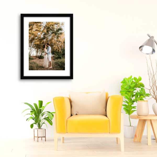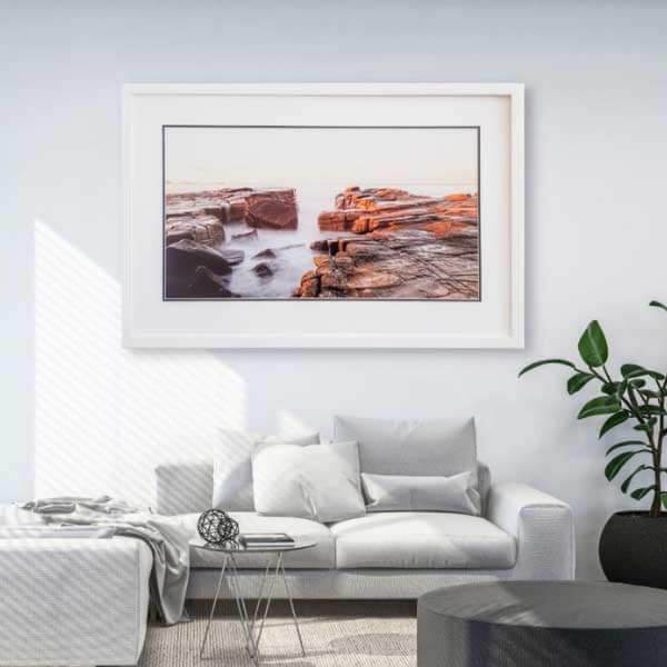 Statement landscape photo extends the impression of the room and pulls the attention of the viewer right to the centre. To best achieve this, the artwork should be set within a room with a neutral colour palette and hung at eye level. This landscape photo was framed in a matching white frame and matboard, letting the photo do all the talking for the room.