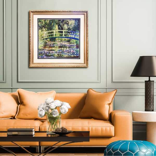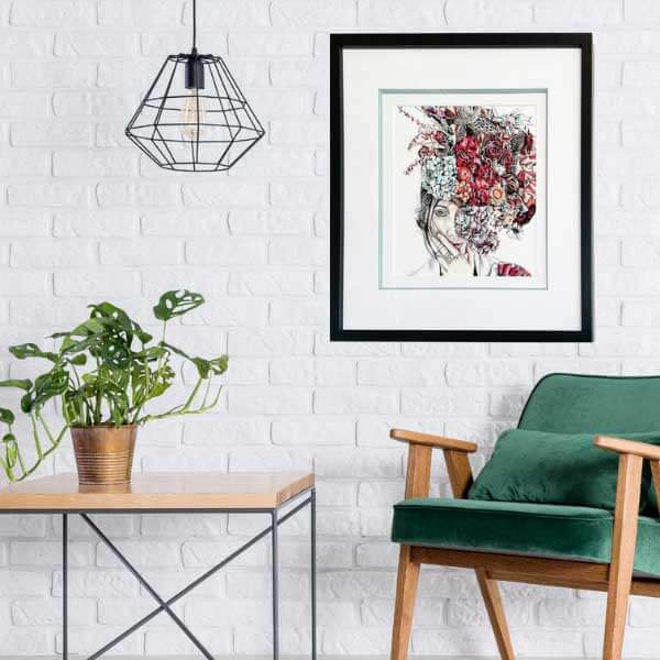 This painting has been framed within an off- white matboard with black embossing. To finish, a gold frame moulding with a subtle leaf detail carefully borders the artwork. The complete artwork is set against a neutral green wall with its own square shapes. The centring of the artwork both blends in and stands out against the geometry of the wall. Again, the choice of the frame colour in this space looks like a direct bridge between the artwork and statement couch.