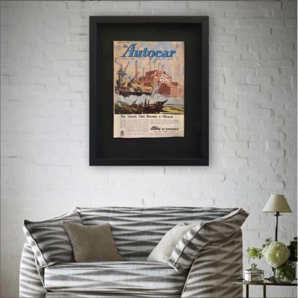 This matboard-heavy frame draws all focus to the artwork, while giving the impression of a floating piece. To ensure the art is protected this vintage 1984 Autocar magazine has been thoroughly framed to conservation framing standards – using acid-free matboards, UV glazing (picture frame glass) and a non-reflective finish.