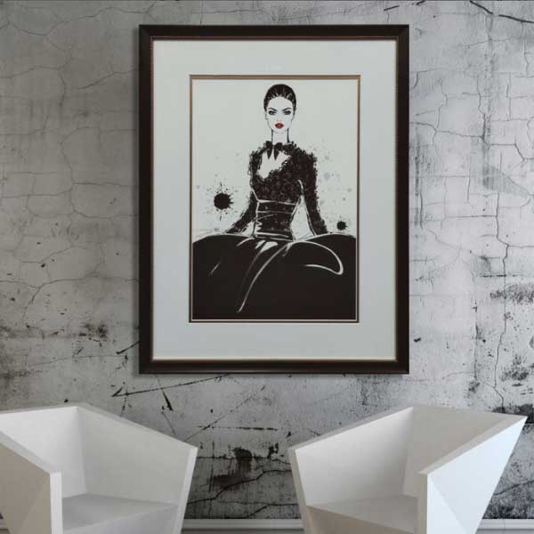 Continuing the idea of centring statement artwork in the living room, a large artistic portrait gives character to an otherwise featureless wall. A white and gold double-mat was added to this stunning black and white print with red lip colour. The finished framed art is tied together with a black frame and gold patterned embossing.