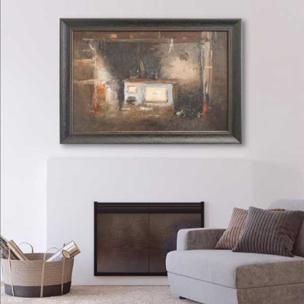 Oil paintings come with a sense of traditionalist styling, usually found in old country manors and log cabins. For the average city dweller, this may be the closest they may come to recreating that same charm at home. This Colin Parker original - “The Smokey Kitchen – Sorala” (1976) has been transformed with a rustic black and brown frame to bring out the old wood Stove and complement the details of the fireplace.