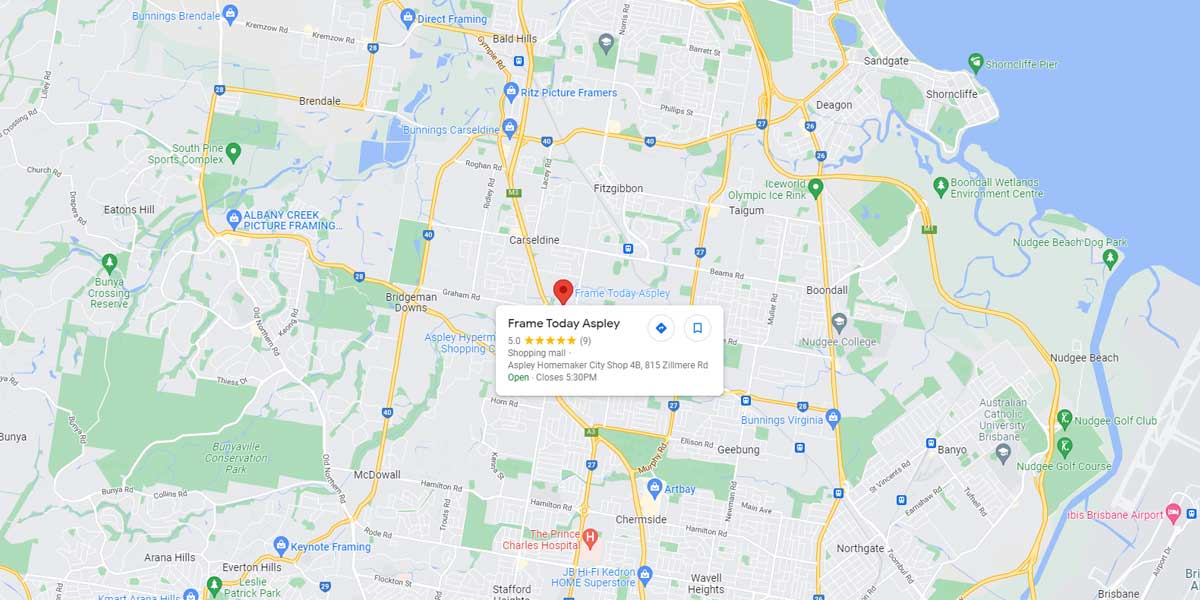 The first Queensland store to open was in June 2021 in Aspley, conveniently located in Aspley Homemaker City on Zillmere Road, just off Gympie Road in Aspley. The store consists of a showroom where our trained Framing Consultants guide customers though the plethora of framing choices so they make the best selection to suit their budget, styling, personal taste and timeframe. The workshop is fully equipped with tools and machinery to ensure all workmanship is of premium quality… perfect cuts and joins on all frames, matboards, glass and backing… for every job.