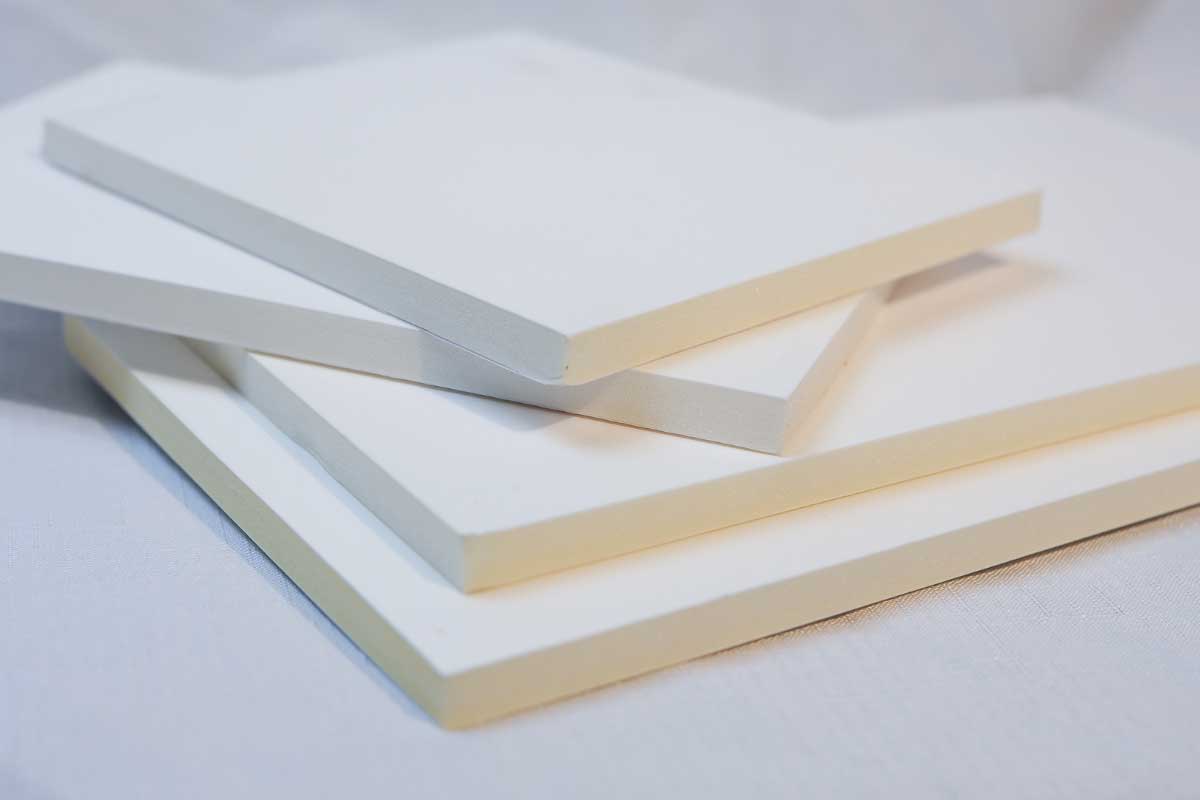 A foam board usually consists of three layers. The first is an inner layer of polystyrene or polyurethane foam. This is clad with white coated paper or cotton archival paper and it's this layer that protects your piece.